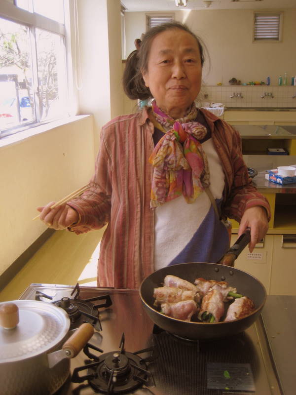 Our crew worked together to crank out the dishes, and before long we were sitting on low stools, ready to eat, watching the blue cheese happily ooze from it's porky caves. I felt nervous again. Is the pork gonna be dry? Why didn't I make a vegetable side dish? Am I only contributing to the stereotype that Americans only like meat and potatoes? But, soon enough, I heard the familiar chorus of "oishi!" and relaxed into my lunch.